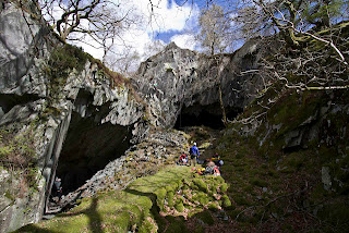 To approach this quarry take the path as for the previous quarry but leave the path for a small track to the right of the active quarry (stay clear of the crumbling quarry edge to left!) to a flat mossy area. Pass this to a higher terrace and then pass an old tunnel entrance, then traverse scree to 2 old quarry buildings. Go up the steps and the quarry is on the left.