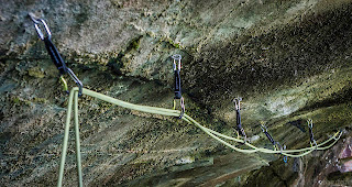 A line of 5 bolts and a lower-off have been added by Pete Holder climbing the wall right of and above the tunnel entrance in the lower part of the quarry, down and right from the descent rope access.